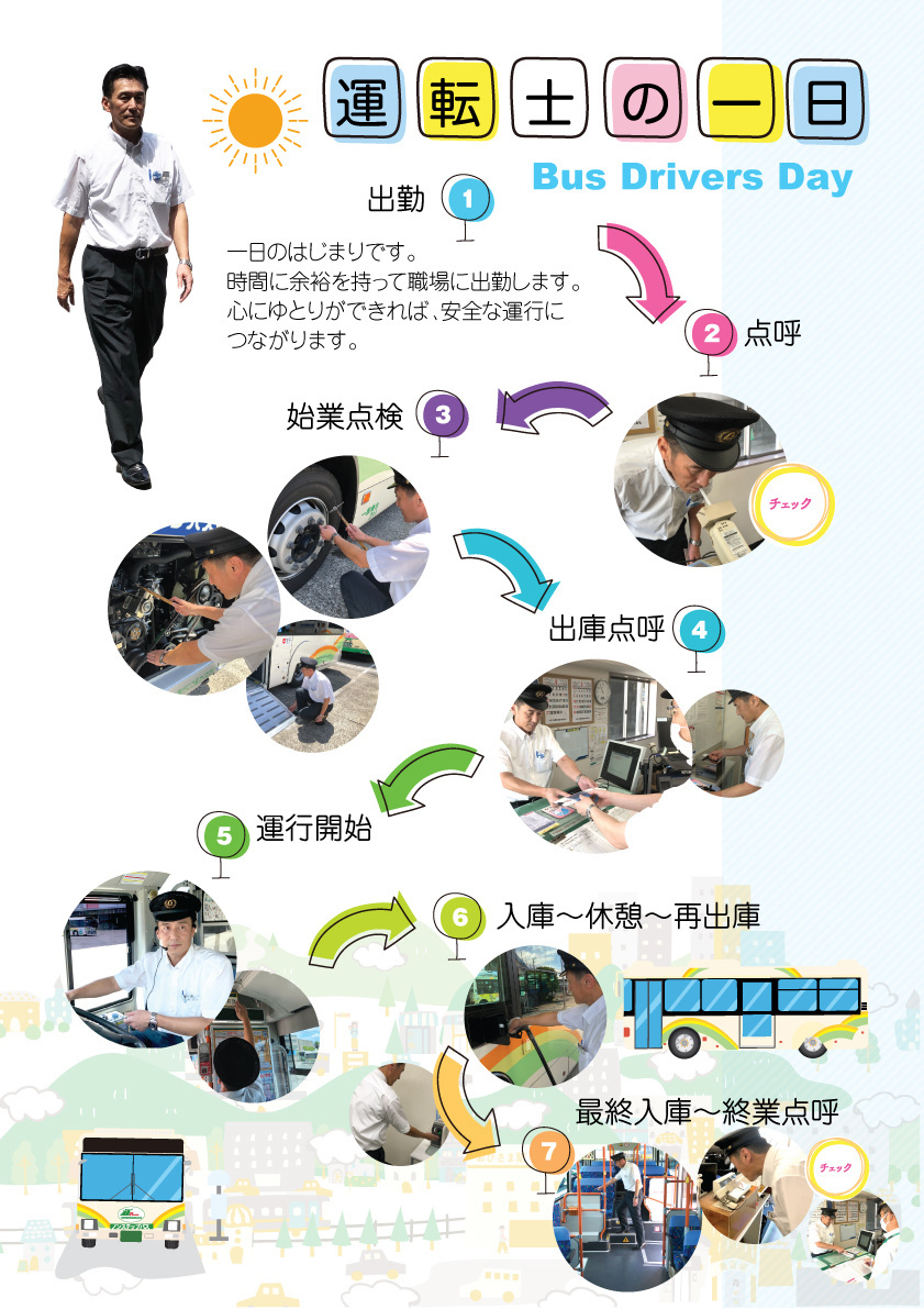 健康状況・睡眠不足のチェック等の確認等を行い、問題がなければ運行管理者から天候・道路状況・業務上必要な指示や注意を受け、その日乗務するバスへ始業点検に向かいます。